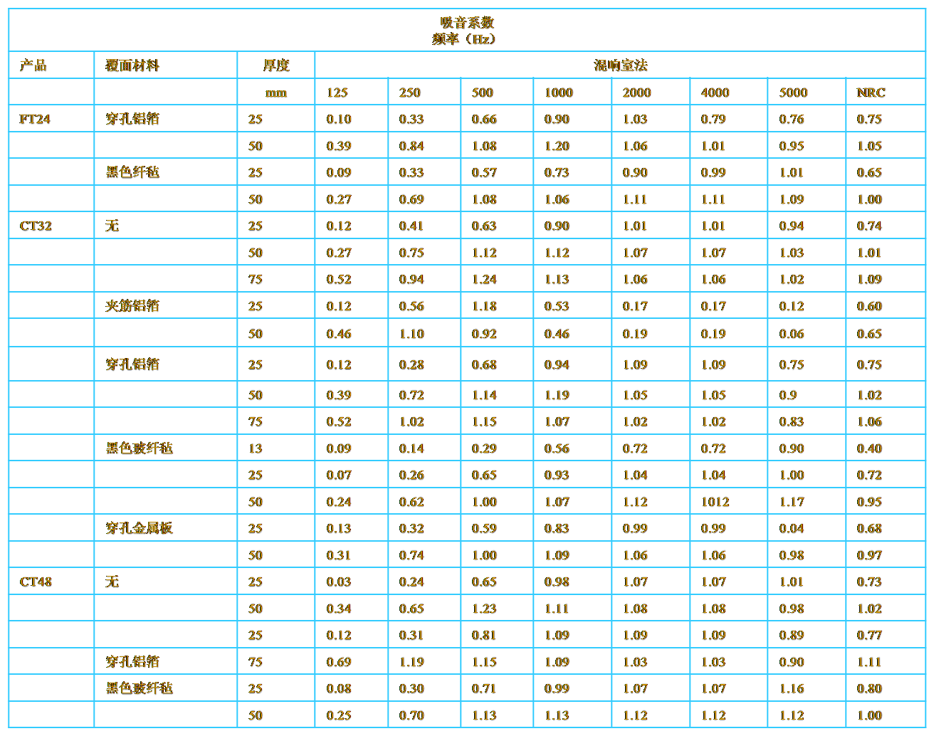 影響玻璃棉吸聲系數(shù)的因素: 1)密度 密度越高,一般來說吸聲性能越好。國內(nèi)權(quán)威機構(gòu)多年檢測結(jié)果表明,當玻璃棉板密度達到96k以上,吸聲性能因面密度提高,吸聲性能反而下降,聲波反射,此時玻璃棉板主要起隔聲作用; 2)厚度 厚度越厚,吸聲性能越好; 3)環(huán)境濕度 濕度增加,吸聲性能相應提高 4)纖維直徑 產(chǎn)品平均纖維直徑約細,吸聲性能越好 5)玻璃棉復合其它吸聲面料或穿孔面料,能提升吸聲性能 6)纖維分布均勻度越高,整體吸聲效果越好 玻璃棉吸聲系數(shù)表: